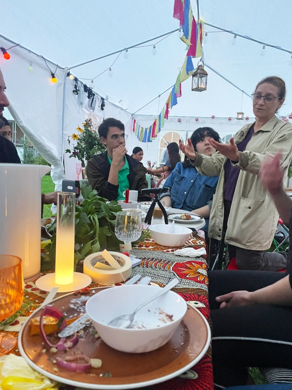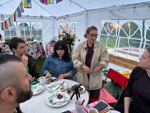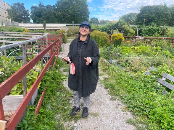 Hon är aktiv i grannodlingen på gården där hon bor i Vårberg. Hennes odling är inte jättestor, men den innehåller allt. Grönsaker, bönor, tomater, kryddor, blommor. Den ger massor med mat och skönhet på samma gång. Vi har träffat några av medodlarna, men inte alla. Ändå känns det som att jag träffat allihop, för hon har berättat så mycket om dem, var de kommer ifrån, vad de odlar och varför.